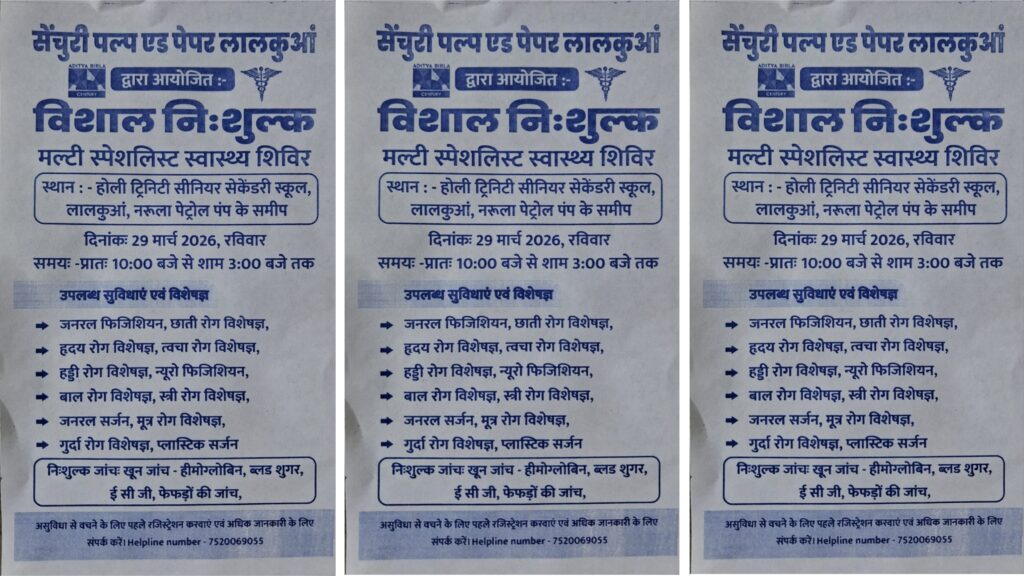 लालकुआं। क्षेत्र के लोगों को बेहतर स्वास्थ्य सुविधाएं उपलब्ध कराने के उद्देश्य से 29 मार्च 2026 (रविवार) को लालकुआं में एक विशाल नि:शुल्क मल्टी स्पेशलिस्ट स्वास्थ्य शिविर का आयोजन किया जाएगा। यह शिविर सेंचुरी पल्प एंड पेपर, लालकुआं (आदित्य बिड़ला ग्रुप) द्वारा आयोजित किया जा रहा है।